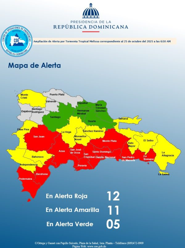La Temporada Ciclónica 2025 cobra un tono serio con la Tormenta Tropical Melissa, un sistema que avanza lento pero con una intensidad preocupante, poniendo a prueba la capacidad de respuesta del país. El Centro de Operaciones de Emergencias (COE) ha elevado el nivel de advertencia, manteniendo 11 provincias y el Distrito Nacional en alerta roja, el máximo grado de peligro, mientras el ciclón amenaza con convertirse en huracán en las próximas horas.